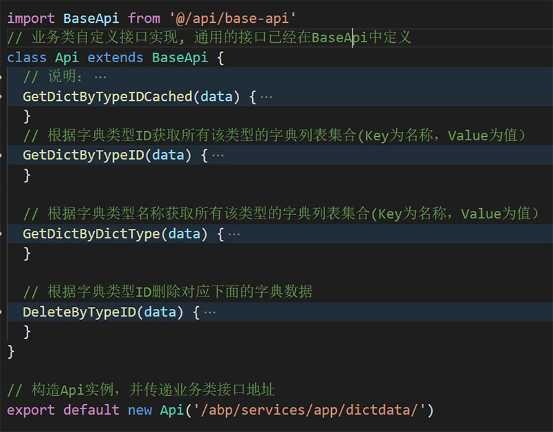通过一行代码exportdefaultnewApi('/abp/services/app/dictdata/') 就可以构造一个子类实例供使用了。