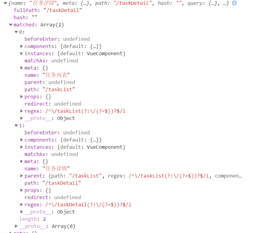 其中$route.matched是一个数组,包含了当前路由的所有嵌套记录,即 routes 配置中的对象数组,包括 自己的信息和 children 数据。比如我的 routes 配置为: