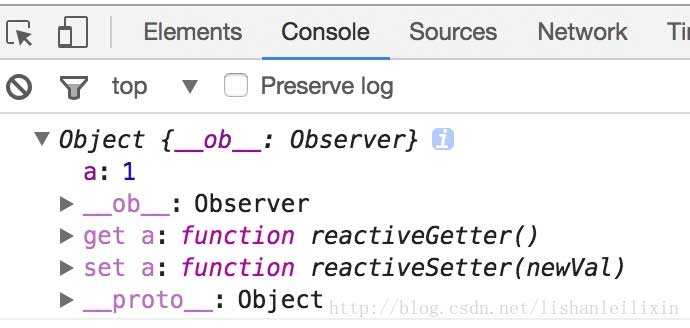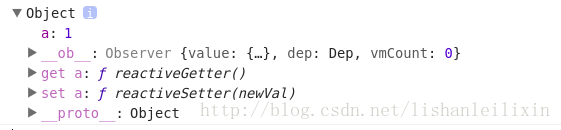在打印结果中我们可以看到属性a有两个方法:get和set.为什么会有这两个方法呢,这正是vue通过Object.defineProperty()进行数据劫持的.