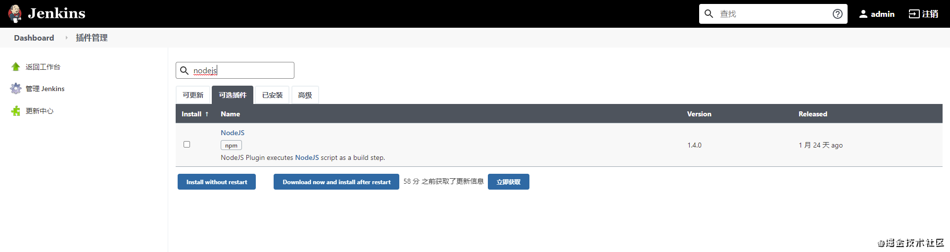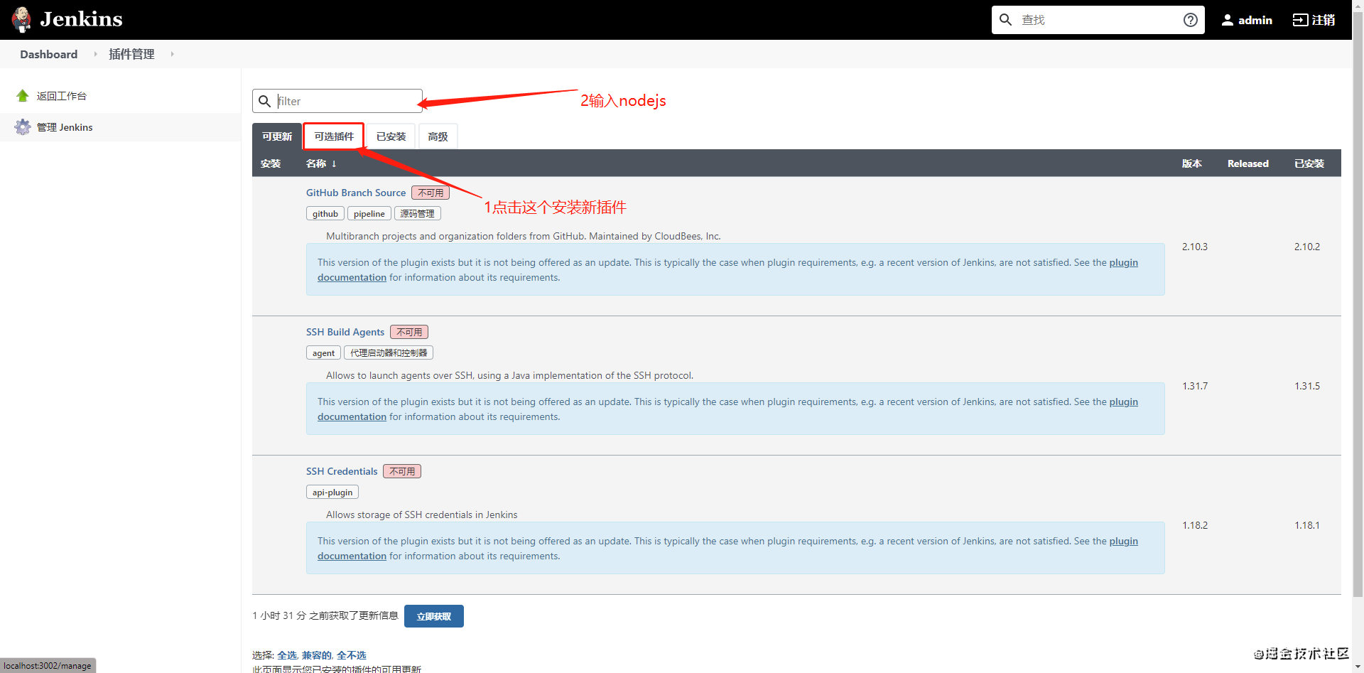 > 打包vue项目需要nodejs,打包完成后需要通过ssh把打包好的文件上传到目标服务器上。所以下面我们将会来安装jenkins的nodejs插件和Publish Over SSH插件。