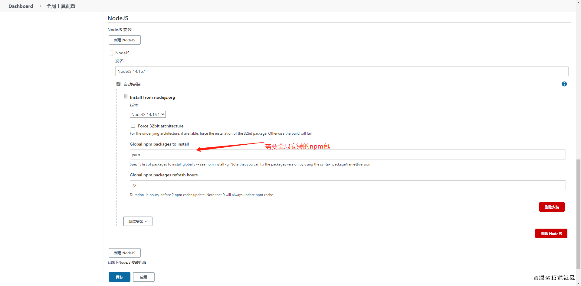 在jenkins主界面工作台,依次点击系统管理>全局工具设置进入插件管理界面并找到NodeJs选项(如下图)