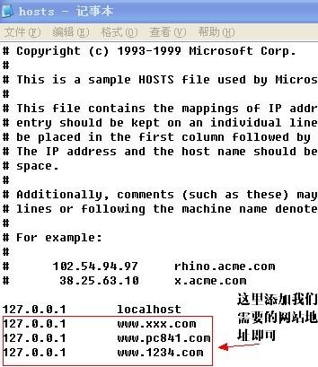 选择记事本确定之后即可打开设置屏蔽网站的文件了,我们只需要按照以下格式输入需要屏蔽的网站地址即可,如下图: