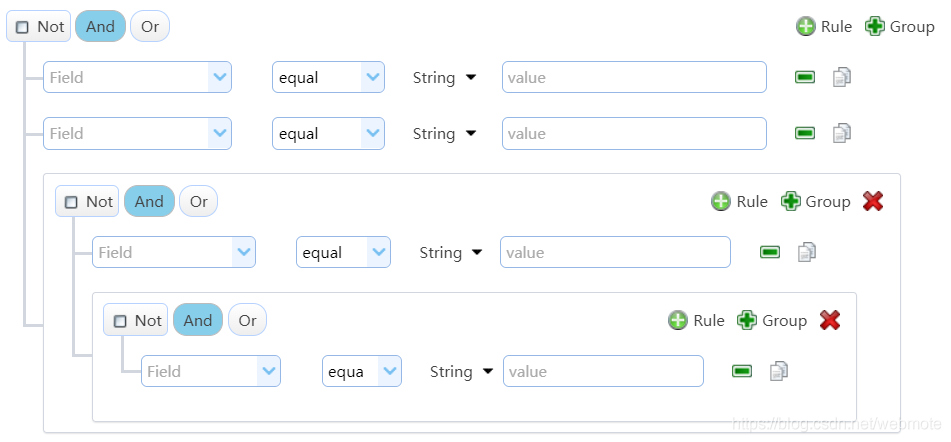 动态查询规则,大致如下图所示。是可以按照用户的自定义进行组织查询语句的一种复杂组件,大致可以实现SQL查询的where条件,下面是摘自mongodb的某一软件。