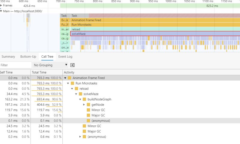 很明显 solveMaze 函数占据了大多数时间,展开下面的 Call Tree: