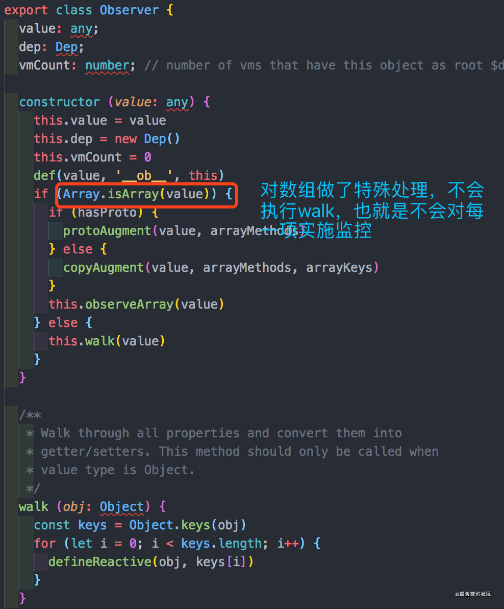 Object.property是可以检测到通过索引改变数组的操作的,而Vue没有实现。那我们看看源码: