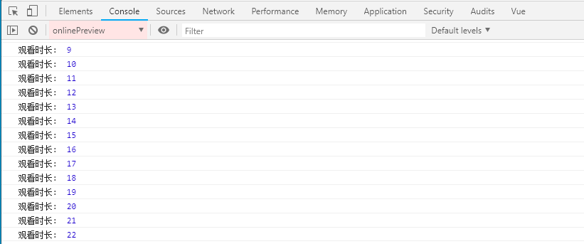 调用了开始计时的方法,终于我们可以在 console 的 log 中可以看到输出了当前的时长