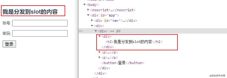 从效果图(下图)中我们可以看到h2标签的那句话已经被渲染在了页面上,标签位置也对应上了slot.vue文件中的标签