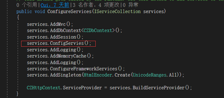 首先,我们看startup类的ConfigureServices方法,我们会发现我们所有的服务都是使用IServiceCollection注入进去的