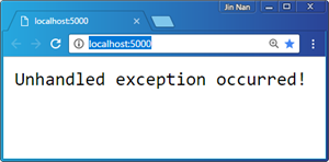 如上面的代码片段所示,这个作为异常处理器的RequestDelegate仅仅是将一个简单的错误消息(“Unhandled exception occurred!”)作为响应的内容。当我们利用浏览器访问该应用的时候,这个定制的错误消息将会以如图4所示的形式直接呈现在浏览器上。