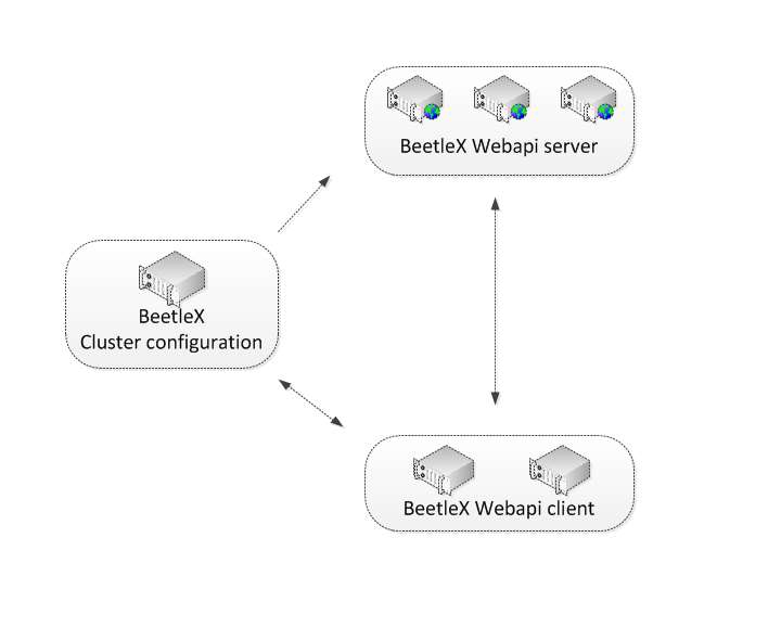 Beetlex的Webapi集群应用并没有依赖于第三方服务,而是由Beetlex自身完成;它主要是通过Client和策略监控服务相结合的方式来实现集群化的服务负载访问。以下是服务结构: