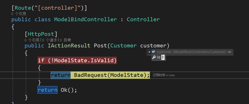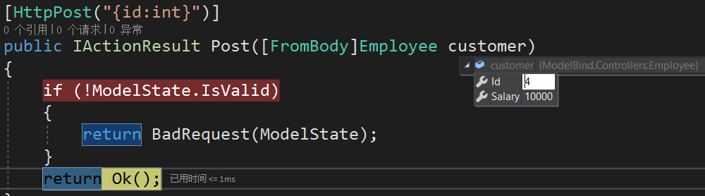 到这里想必我们明白了在控制器上通过ApiController修饰解决了第一个问题:在添加MVC框架时,会为我们注入一个ModelStateInvalidFilter,并在OnActionExecuting方法期间运行,也就是执行控制器方法时运行,当然也是在进行模型绑定之后自动进行ModelState验证是否有效,未通过则立即响应400。到这里是不是就这样完事了呢,显然不是,为何,我们在控制器上通过ApiController来进行修饰,如下代码: