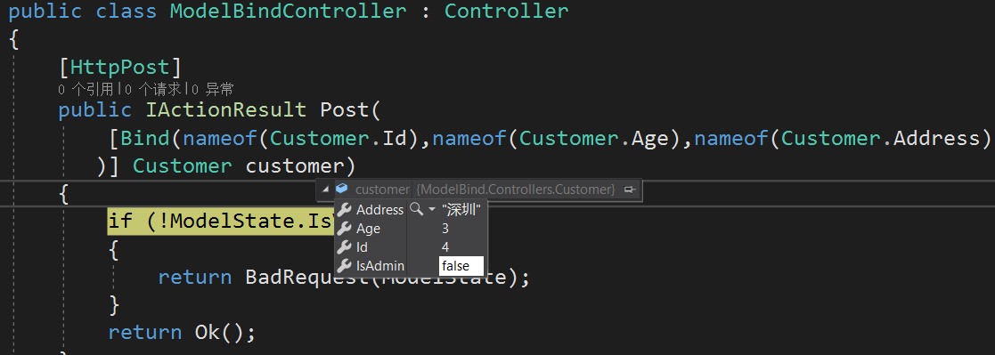请求参数安全也是需要我们考虑的因素,比如如下我们对象包含IsAdmin属性,我们后台会根据该属性值判断是否为对应角色进行UI的渲染,我们可以通过[Bind]特性应用于对象指定映射哪些属性,此时请求中参数即使显式指定了该参数值也不会进行映射(这里仅仅只是举例说明,例子可能并非合理),代码如下:
