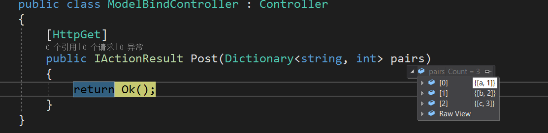 public IActionResult Get(List<Dictionary<string, int>> pairs)