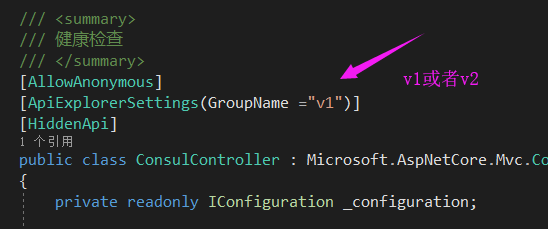 然后还要在我们的控制器上面标注swagger文档的版本