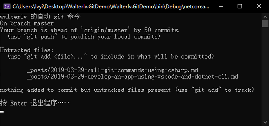 var git = new CommandRunner("git", @"D:DevelopmentsBlogswalterlv.github.io");