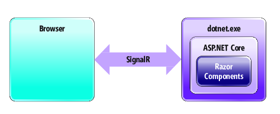 也可以使用 .NET Core 在服务器上运行相同组件,其中所有 UI 交互和 DOM 更新都是通过 SignalR 连接进行处理,如图 2所示。执行后,组件跟踪 DOM 所需的更新,并通过 SignalR 连接将要应用的这些更新发送到浏览器。UI 事件使用同一连接发送到服务器。此模型的优点有多个:下载大小更小、代码集中在服务器上,以及受益于在 .NET Core 上运行组件的所有功能和性能优势。