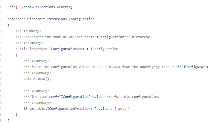 可以看到这里最后返回的是一个 IConfigurationRoot 对象,再来看 IConfigurationRoot 源码
