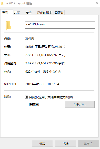 经过以上步骤下载完毕后,安装包的大小如下图所示,比 VS2017 的还少占用了部分空间(在安装 VS2017 时,这几个工作负载及组件下载后占用 3.15G 空间)。