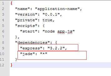 这样说明了需要2个库,一个是express,令一个是jade,那么我们现在来安装它,如果很多模块安装岂不是要执行很多次命令,这里有一个命令比较简便,它会检查当前的package.json的依赖库进行安装: