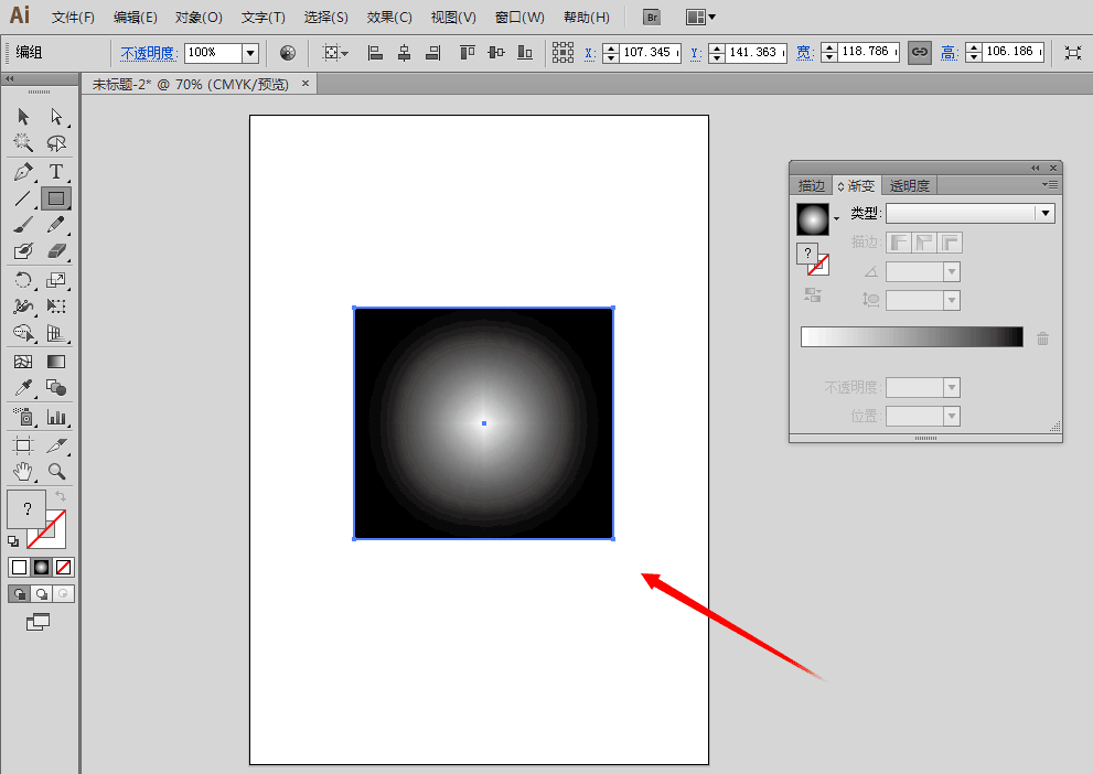 1、随意在画布上绘制一个矩形,并且点击渐变面板上的渐变滑块,填充上黑白渐变色