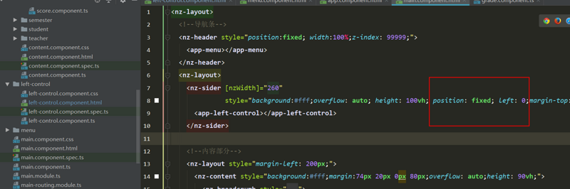- 将我们的导航栏的代码全部注释,换成官方的示例代码,发现问题依然存在,说明我们侧导航栏的样式写得有问题