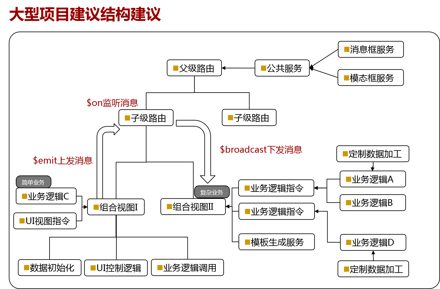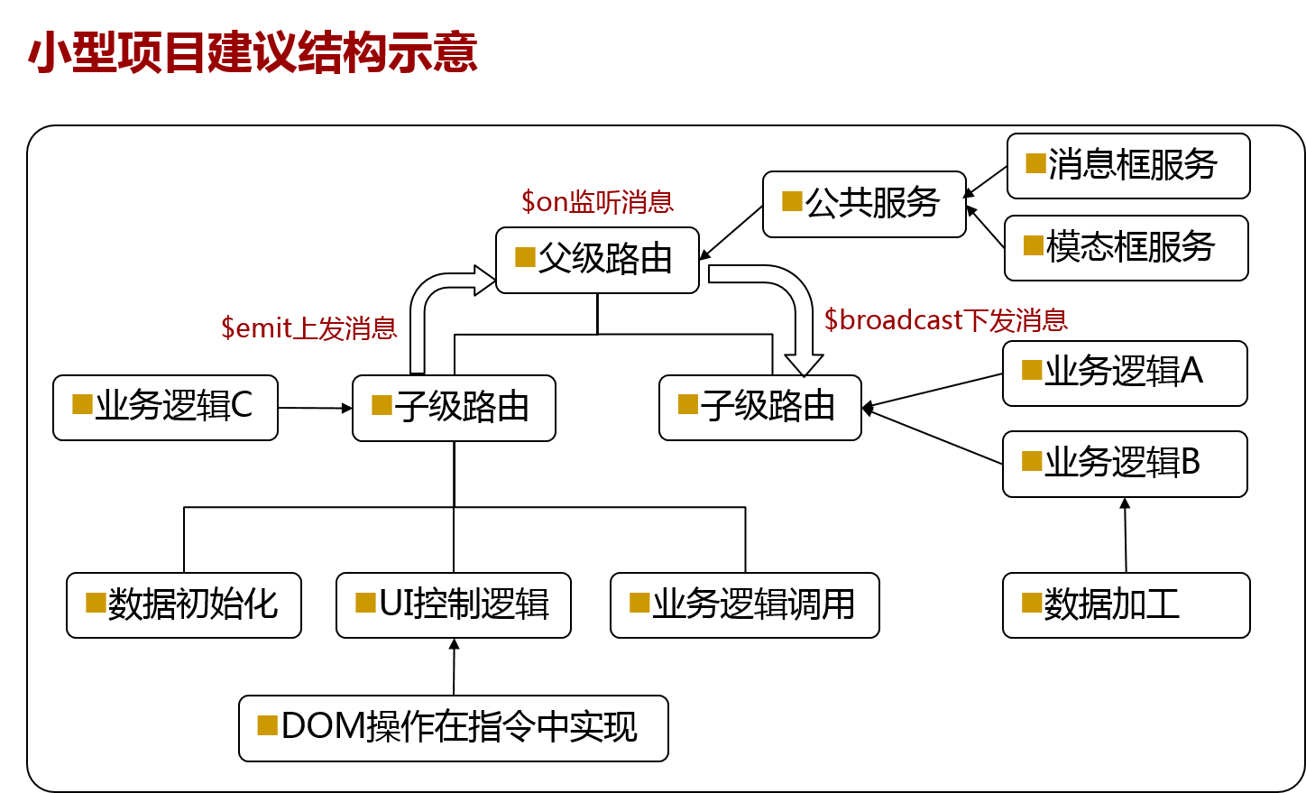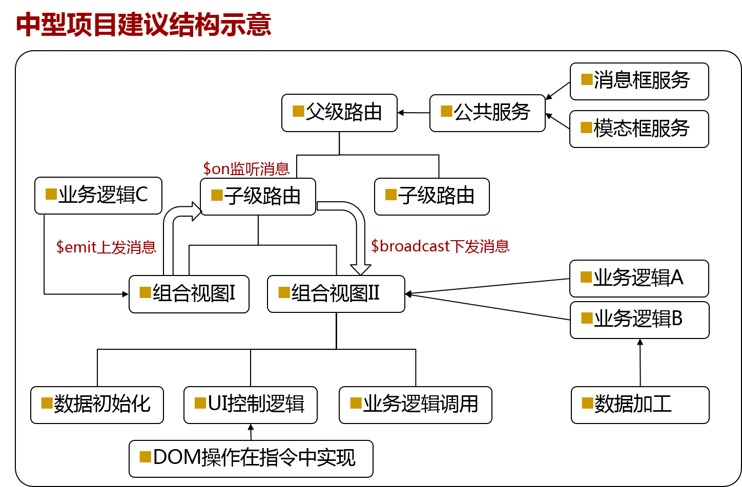 通过视图组件指令,业务模块指令来进行更细粒度的模块拆分,模块通信依然建议通过消息机制来进行。