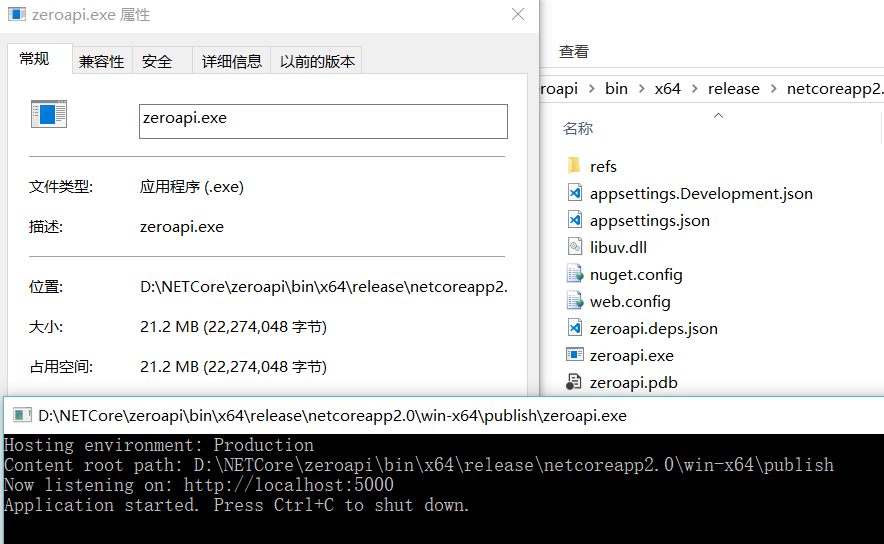 发布完成后,打开binx64releasenetcoreapp2.0win-x64publish 文件夹,里面zeroapi.exe即为最终文件,执行即可。