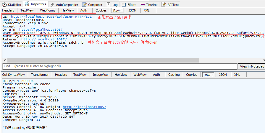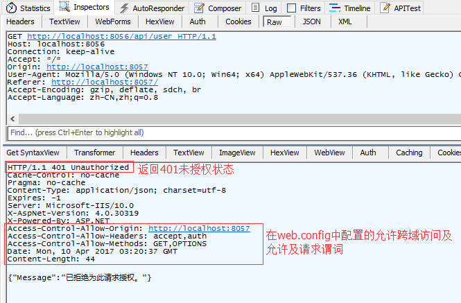 接下来,在不登录和登录的情况下,调用获取数据的接口,并使用fiddler监视一下请求和响应的过程.