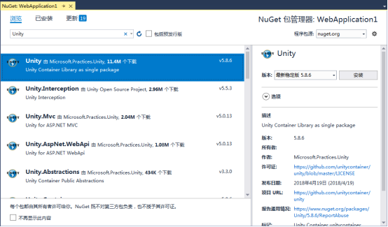 在项目引用上右击,管理Nuget程序包,搜索到Unity并安装。