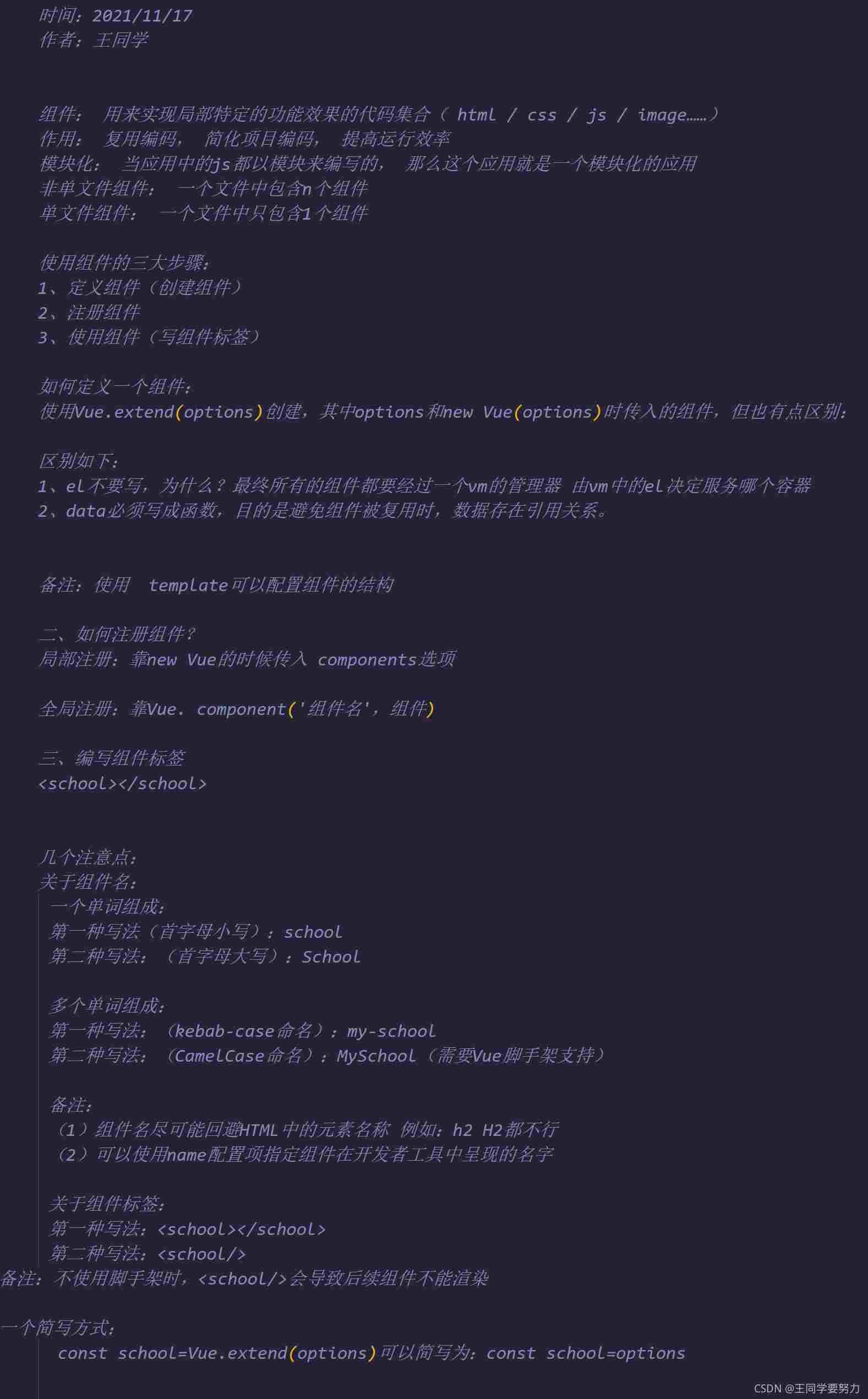 //组件定义时 一定不要写el配置项,因为最终所有的组件都要被一个vm管理 由vm决定服务于哪个容器