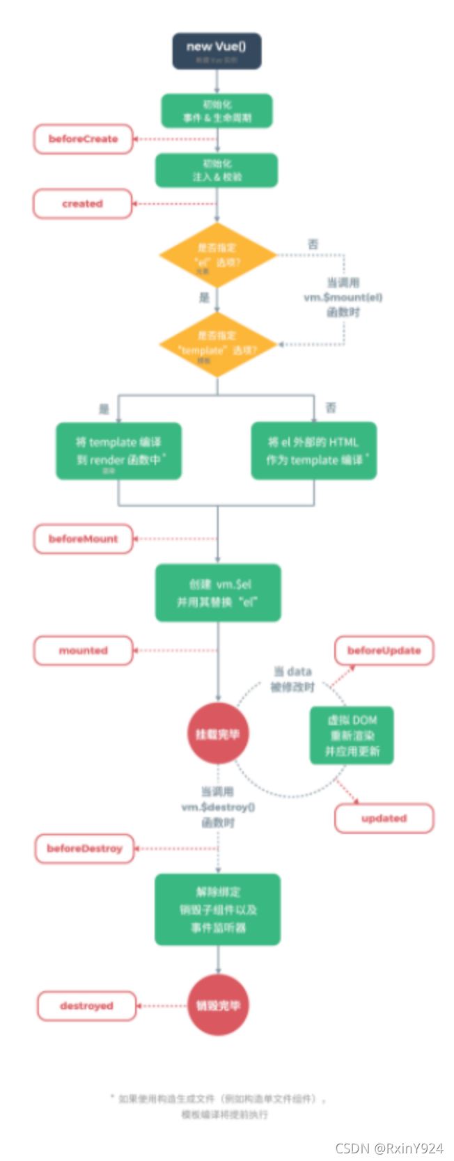 Vue实例从创建到销毁的过程,就是生命周期。详细来说也就是从开始创建、初始化数据、编译模板、挂载Dom、渲染→更新→渲染、卸载等一系列过程。
