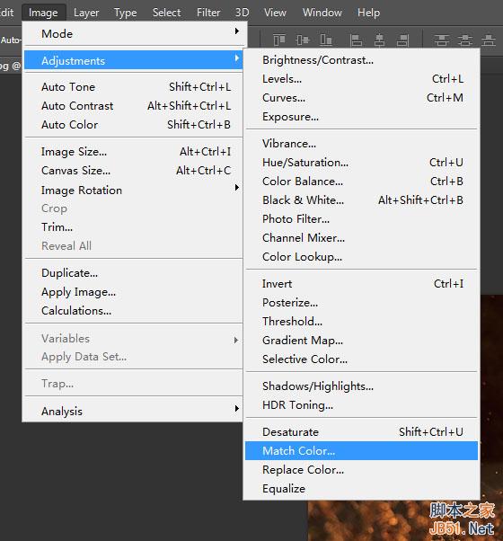 把两张图片都用PS打开。切换到草地图片,选择菜单中的图像——调整——匹配颜色。