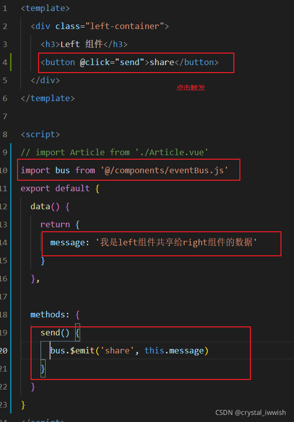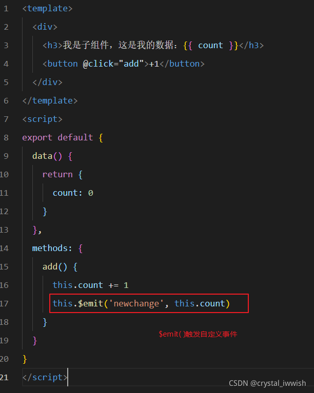 2. 在数据发送方,调用 bus.$emit(‘事件名称', 要发送的数据) 方法触发自定义事件