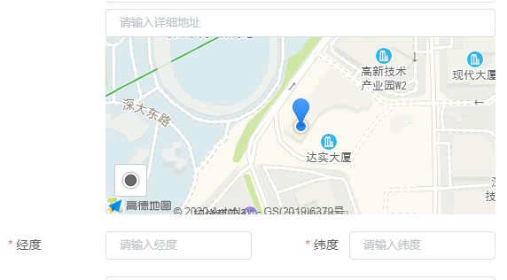 实例需求描述:搜索并选择地址,选中后地图定位到该地址,并获取经纬度自动填入下方的输入框中。