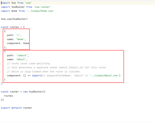 可以看到项目已经自动生成了两个路由,一个是主页home,一个是about界面。路径分别为 '/' 和 '/about' 。