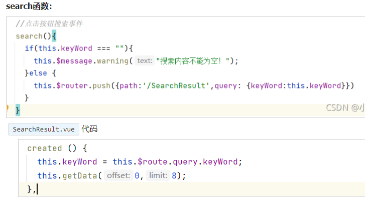由于输入框和显示结果的不再同一view下,所以在路由跳转时将搜索结果传递给显示结果的页面,这里用的query。