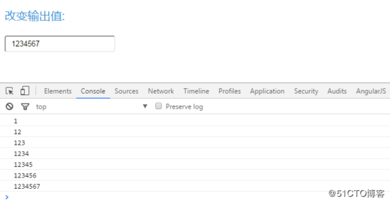 在页面上输入1234567即可看到,每次在页面输入数字后,控制台输出的 $scope,testInfo.content 的值都和页面保持一致:
