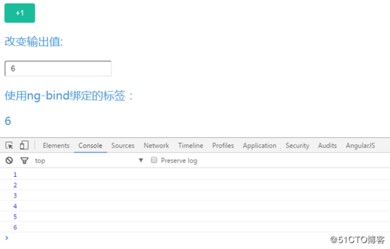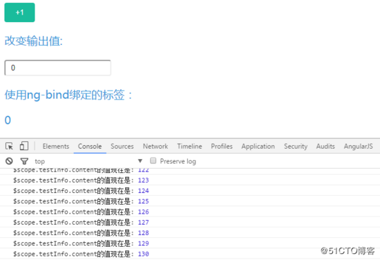 demo中,每次点击 +1 按钮, $scope.testInfo.content 的值会增加1,我们可以看到页面上的结果: