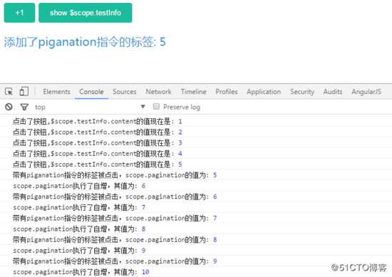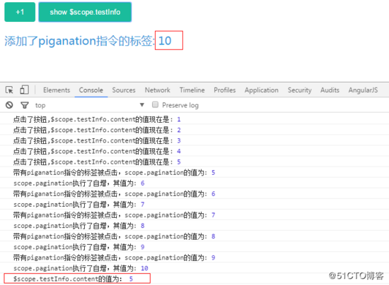 我们看到,第一次点击数字标签时,控制台打出了link函数中 scope.pagination 的值为5,这说明 $scope.testInfo.content 的值被传递给了自定义指令中的 scope.pagination ,也就是说数据从controller流向了directive 。而当我们再点击4次数字标签(一共点了5次)后,从控制台可以看出, scope.pagination 的值已经成为10,而页面上使用 ng-bind 指令获取到的结果却依旧是 5 。也就是说, 数据从没有从directive流向controller 。是不是有一种被骗的感觉?别着急,接着看。