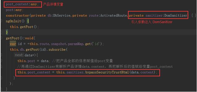 第二步:通过DomSanitizer来解析产品详情,并赋值给一个变量属性 post_content;