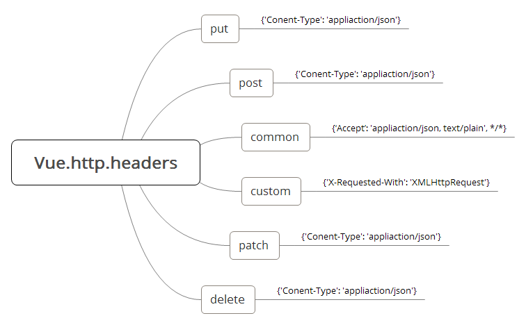 Vue.http.headers键值可以是HTTP方法名,common,custom,三种类型。这三种类型的配置会进行合并,优先级从低到高依次是common,custom,HTTP方法名。