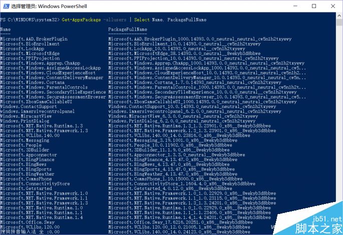 在搜索框输入“powershell”,以管理员身份启动系统自带的Windows Powershell组件,接着输入“Get-AppxPackage -allusers | Select Name, PackageFullName”,通过该命令获取当前系统安装的所有应用。