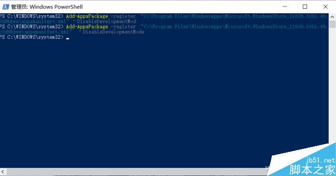 Add-AppxPackage -register “C:\ProgramFiles\WindowsApps\Microsoft.WindowsStore_11608.1001.49.0_x86__8wekyb3d8bbwe\appxmanifest.xml”–DisableDevelopmentMode