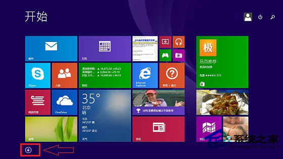 1、进入Win8.1开始屏幕界面,然后点击底部的向下箭头,进入更多选项界面;