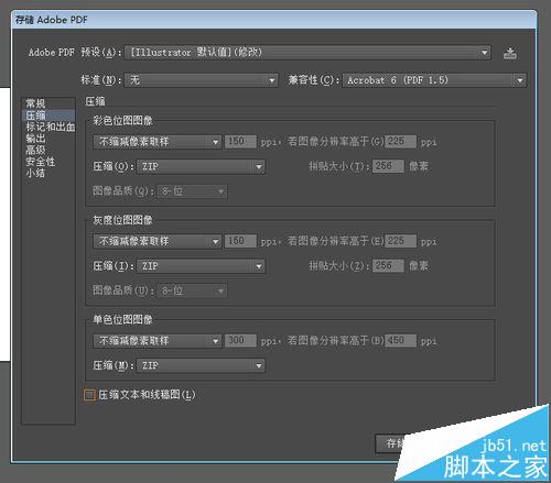 4、ai导出pdf设置 常规和压缩2项内的设置比较关键,常规中的钩都去掉可以缩小文件体积对图像没有影响,压缩中所有的项都不要压缩切记。保存出来了,进行下一步