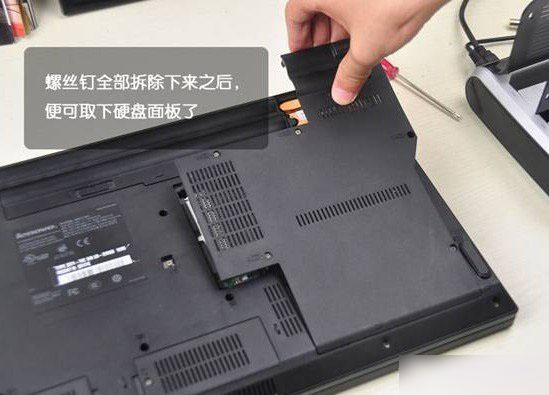 1、首先使用十字螺丝刀,将硬盘仓位的螺丝扭开,螺丝钉全部拆除下来之后,即可轻松取下硬盘背壳面板了,如下图: