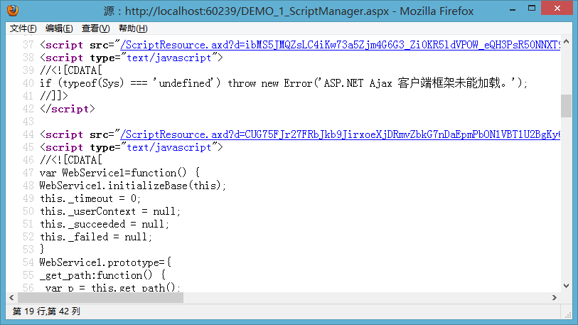 从截图可以看到,除了引入了二个必要的AJAX客户端类库外,还在客户端为WebService1生成了代理脚本。