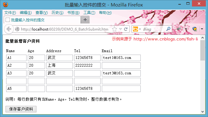 <form id="form1" action="/AjaxDemo/AddCustomer.cspx" method="post"> <p><b>新增客户资料</b></p> <span>Name: </span><input type="text" name="Name" value="abc" /><br /> <span>Age: </span><input type="text" name="Age" value="20" /><br /> <span>Address: </span><input type="text" name="Address" value="武汉" /><br /> <span>Tel:</span> <input type="text" name="Tel" value="12345678" /><br /> <span>Email: </span><input type="text" name="Email" value="test@163.com" /><br /> <br /> <input type="submit" name="btnAddCustomer" value="保存客户资料" /> </form>