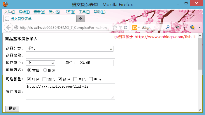 前面的示例都是直接提交表单,没有验证表单的过程,而且都以Textbox控件为主,再来个复杂的表单示例。