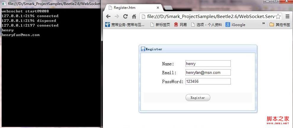 下面通过一个简单的用户注册来体现html5用josn和websocket进行交互的处理过程.由于经过封装处理所以使用起来非常方便.